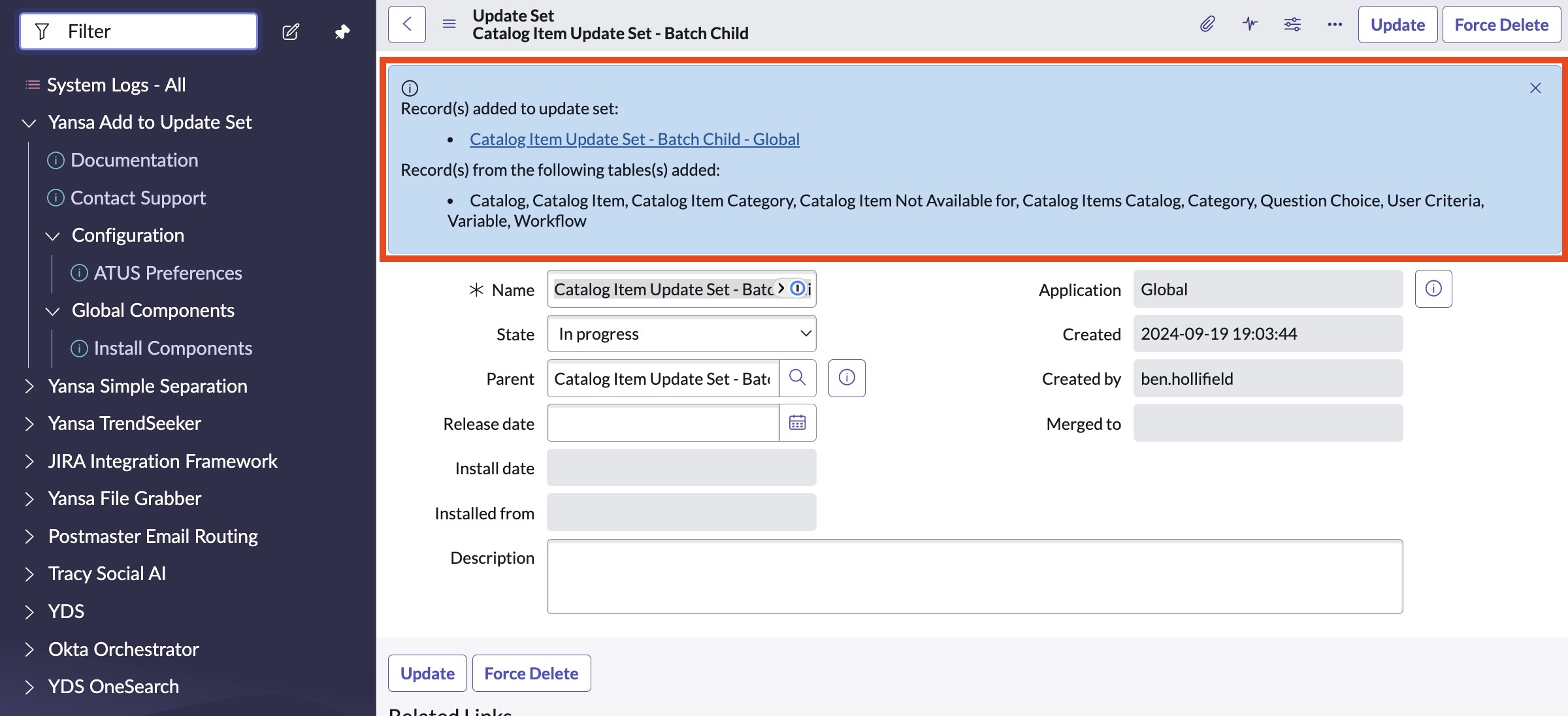 In the case of multi-scope record sets, the utility will automatically generate appropriate update sets in each application scope, bundling them under a batch update set for simple promotion to other ServiceNow instances.