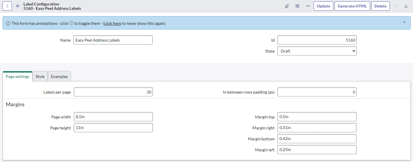 After all configuration has been set (including the Label Dimensions below), click the Generate HTML button in the form header to generate these Label Examples.