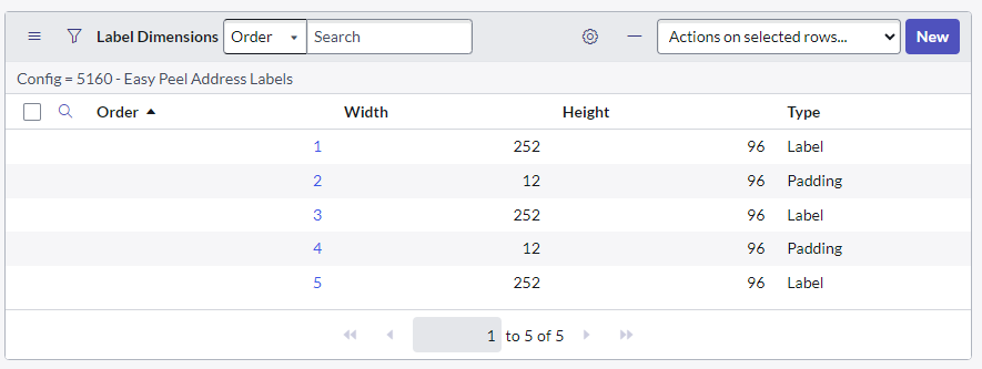 A Label Configuration record must exist for each model of label that you wish to use. The configuration of the Label Configuration contains information about padding, sizing, number of rows, etc. for each page of labels.