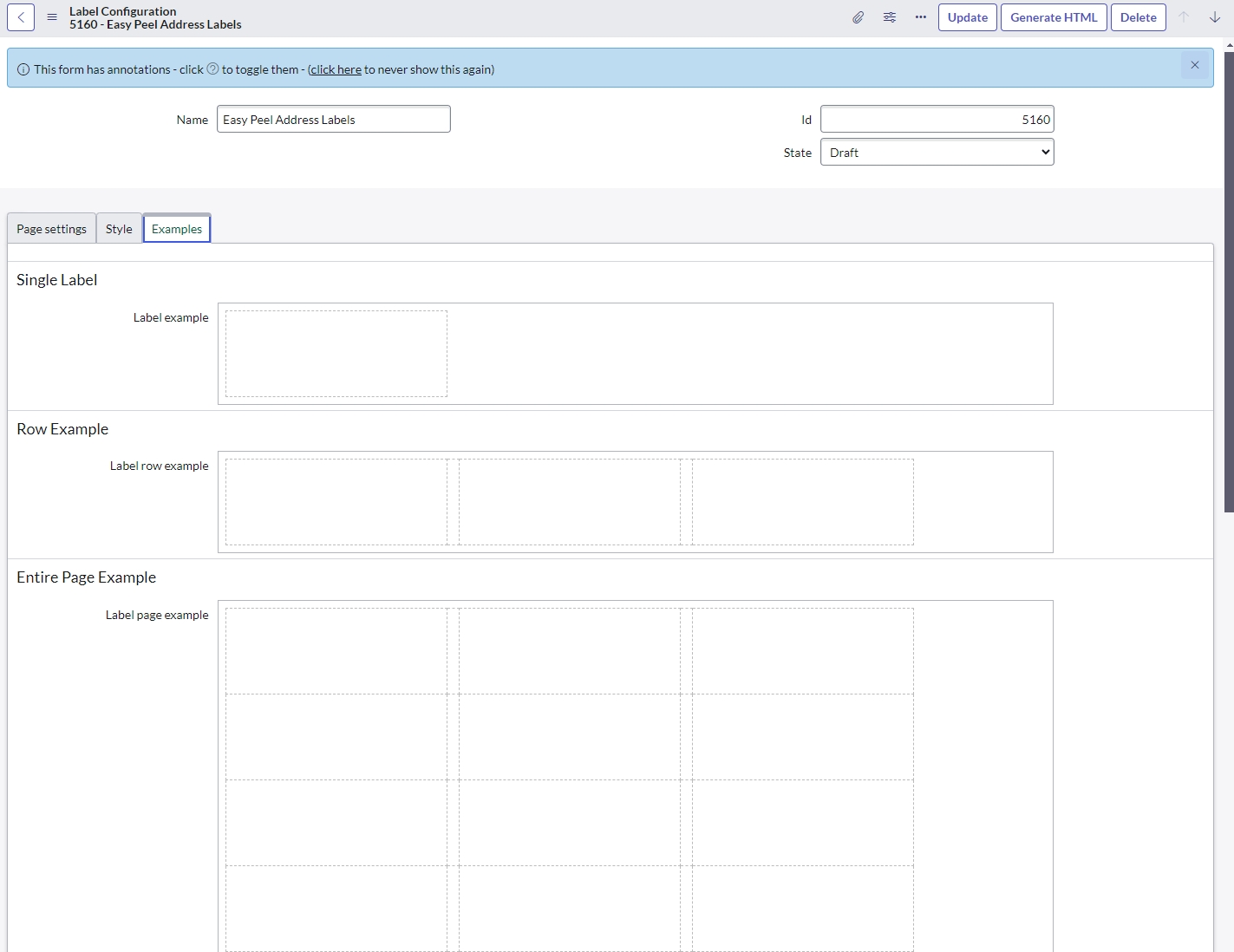 Each time the configuration or dimensions of an Label Config changes, you must click Generate HTML to regenerate example label layouts.