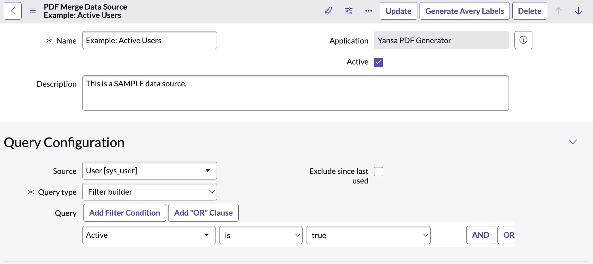 Data Sources are used to gather the multiple records used for label PDF generation. They enable you to specify the pool of records from which to generate labels.