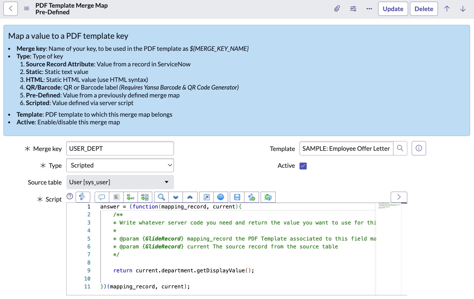 Script: Server-side script allowing you to return any custom content you desire. The source table record ('current') is available. This can be useful to reference dynamic data that is related to the source table record, but unavailable on the source table record itself. This can also be useful to include dynamic data such as date/time content that needs to be generated at the time the PDF is created.