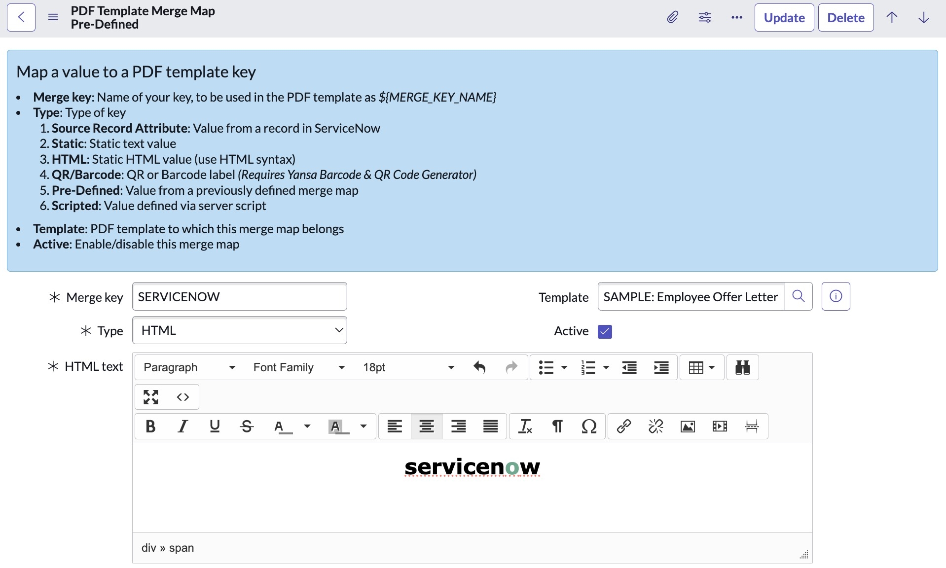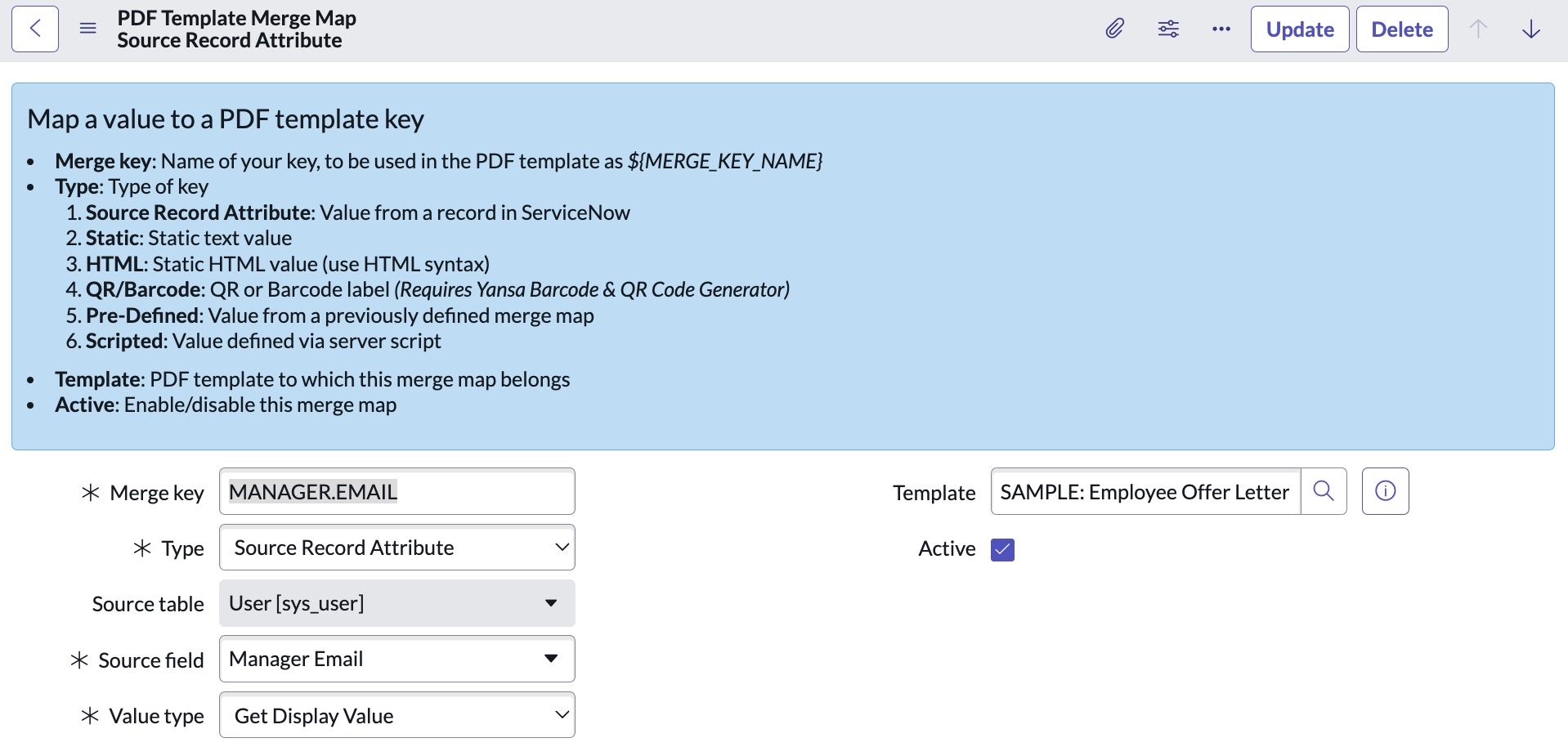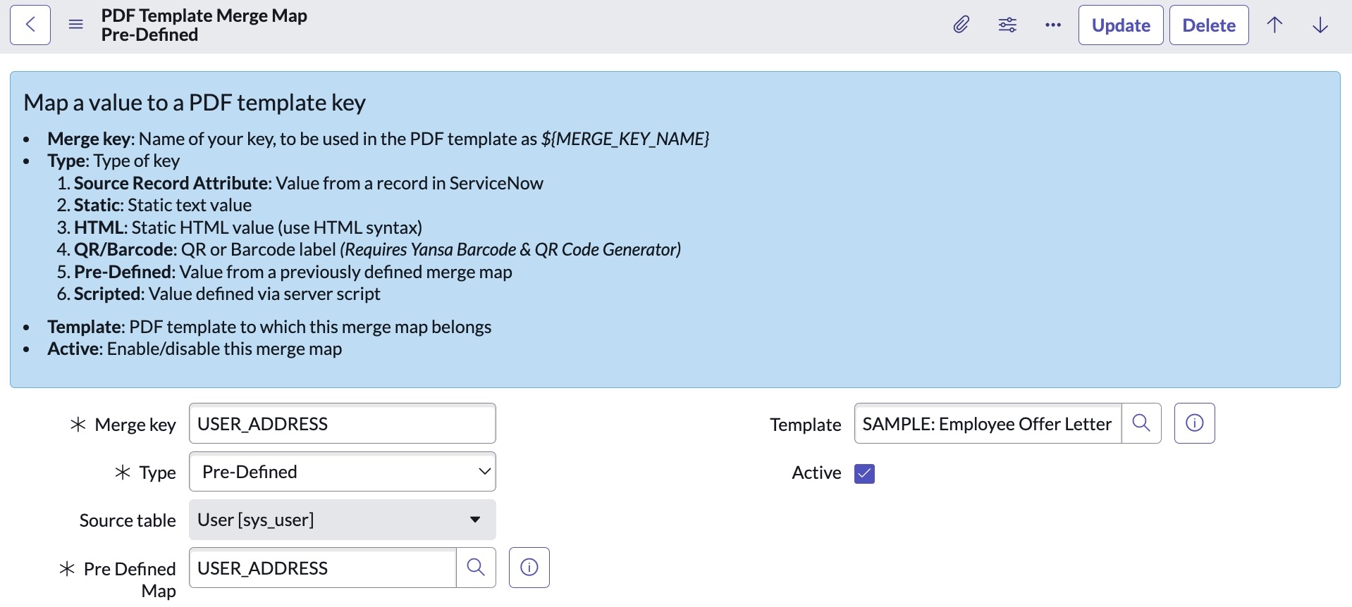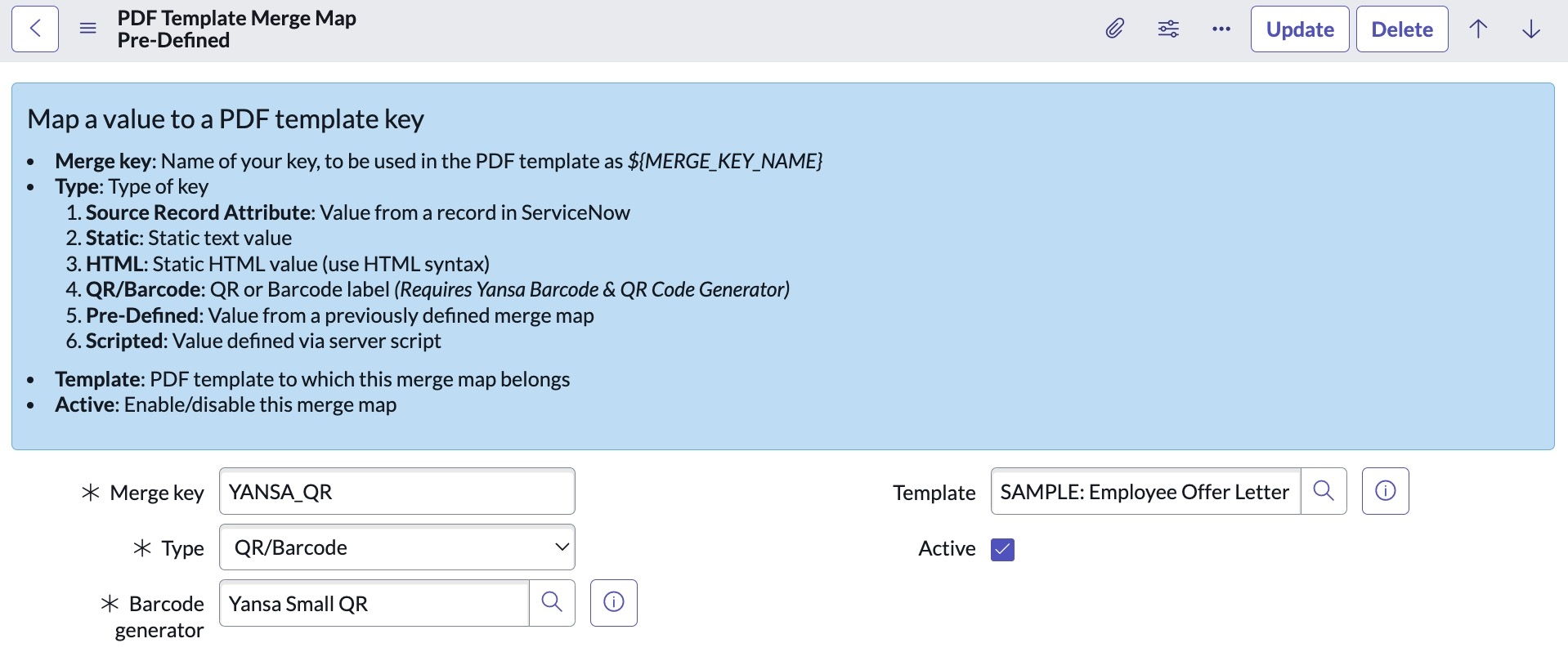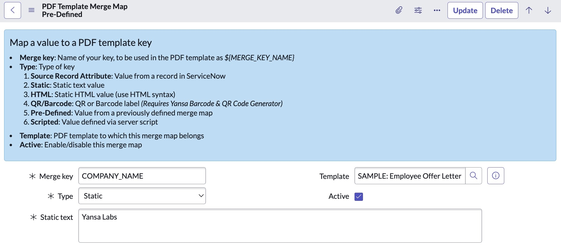 Pre Defined Map: Merge Map records can be predefined via the Yansa PDF Generator -> Merge Maps -> Pre-Defined Merge Maps module in the left nav. This can be useful to create a Merge Map once and then reuse it in multiple PDF Templates. Pre-Defined Maps can be of any type: Source Record Attribute, Static, HTML, QR/Barcode, or Scripted.