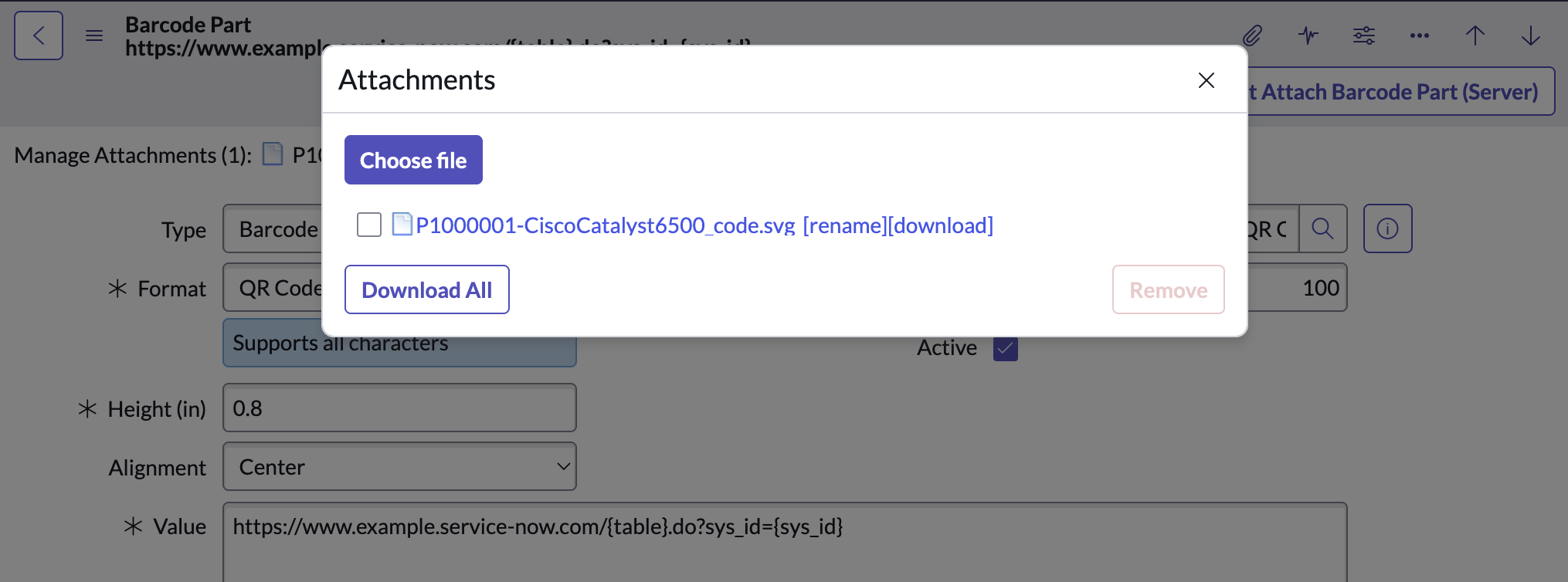 2. Any place where the in-browser view of the barcode label is enabled (form, dialog box (modal), ui page, widget), the 'Attach' button can be clicked to attach the barcode label to a record.