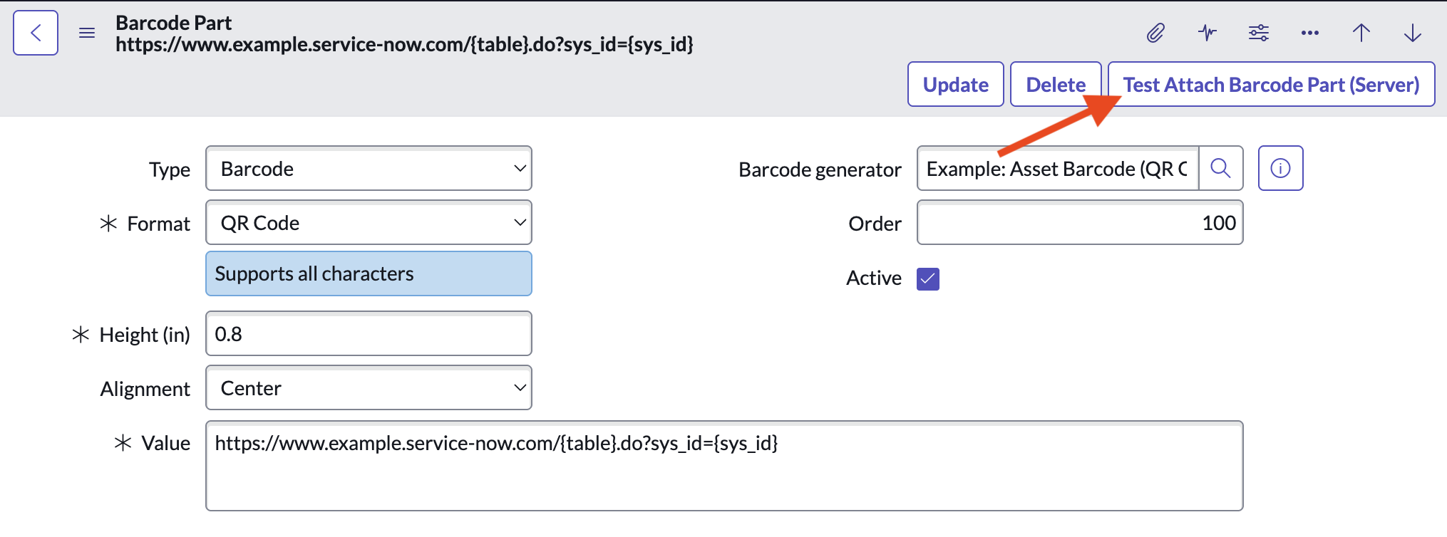 1. Visit **Barcode & QR Code Generator -> UI Actions** in the left nav. Locate and open the UI Action titled 'Test Attach Barcode Part (Server)'.