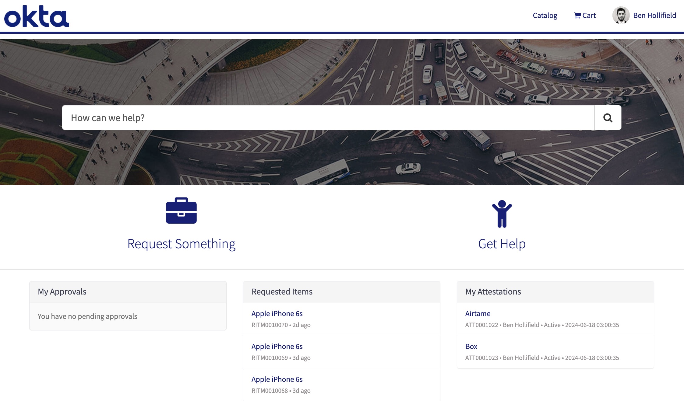 An Okta-specific Service Portal is included with the application to showcase the included Catalog Items. This can be used standalone to serve your users, or you can expose the Catalog Items in your own branded Service Portal or Employee Center.