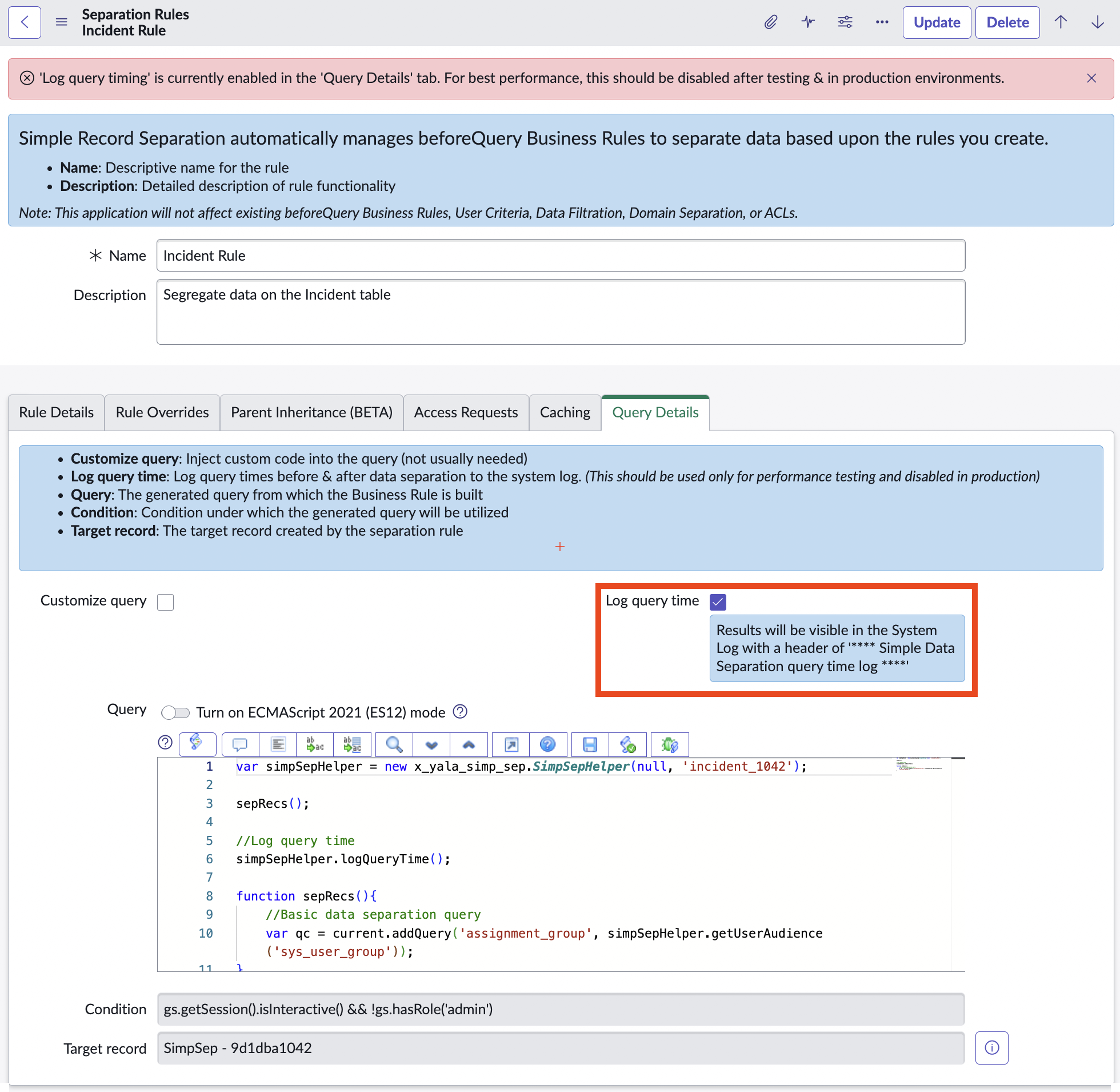 The **Log query time** option can be enabled for any [Separation Rule](https://docs.yansalabs.com/simple-data-separation/technical-docs/separation-rules) in order to access detailed execution time & triage performance issues.